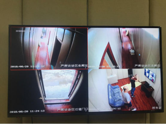 每个谈话室布署1台谈话主机(进行音视频画面合成并传输至指挥中心同时支持实时本地刻录)、4台高清摄像机(其中2台用于全景,能同时监控门和窗户、1台谈话人摄像机、1台被谈话人摄像机)、2只拾音器、1块温湿度显示屏;所有高清摄像机分辨率不低于1080P,全景摄像机采用2.0mm 镜头,角度不低于100度,谈话人摄像机和被谈话人摄像机采用可变焦镜头,能看清被谈话人的面部表情,图像要求可以任意角度旋转;拾音器能满足50平米范围内的声音采集(合理布局拾音器位置,注意卫生间排风系统噪音);谈话指挥可以实现语音和文字交流。